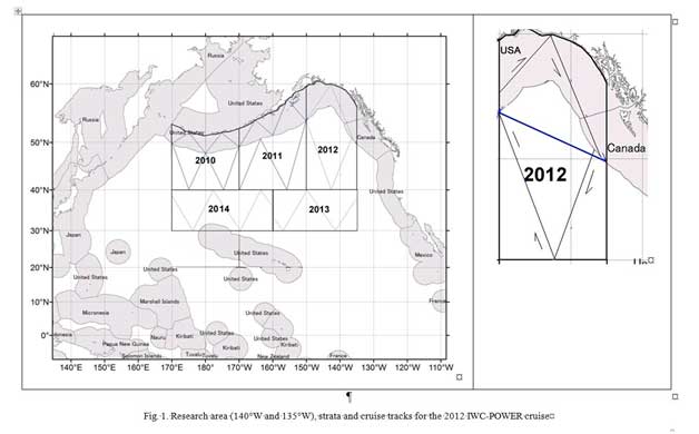 In 2010, a new series of whale research cruises was launched in the eastern North Pacific. The cruises are jointly sponsored by the International Whaling Commission and Japan with collaboration of scientists from the US. The surveys use line transect, photo-ID and biopsy techniques to determine whale distribution and abundance in very large areas of the eastern North Pacific (south of the Alaska coast all the way south to 40� N). A major goal of the cruises is to "provide baseline information on distribution and abundance for a poorly known area for several large whale species/populations, including those that were known to have been depleted [by whaling] in the past, but whose status is unclear". Sally Mizroch participated in the 2011 and 2012 cruises and coordinated and curated all the photo-identification and biopsy data. Photo-ID catalogs were produced for blue whales (9 cataloged in 2011, 4 cataloged in 2012), killer whales (18 cataloged in 2011 and 47 cataloged in 2012), humpback whales (48 cataloged in 2011 and 26 cataloged in 2012), and sei whales (yes, sei whales: 27 cataloged in 2011 and 51 cataloged in 2012). In 2012, one right whale was seen and photo-identified in an area known to have been the site of illegal Soviet whaling for right